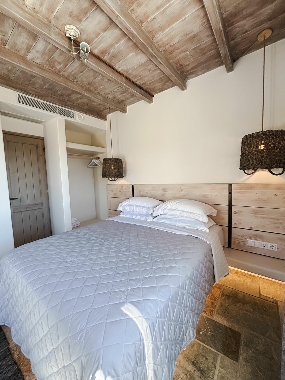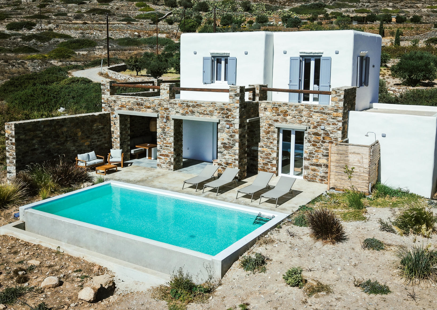 This elegant villa offers two upstairs bedrooms with premium bedding and private en-suites, plus a bright ground floor with a fully equipped kitchen, spacious living room, and extra bathroom. Enjoy satellite Wi-Fi, air-conditioning, and private parking. Outside, relax by your private pool or dine overlooking a serene vineyard—perfect for couples, families, or peaceful island escapes.