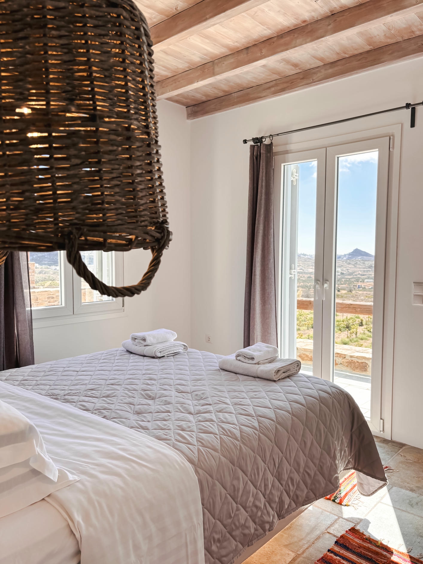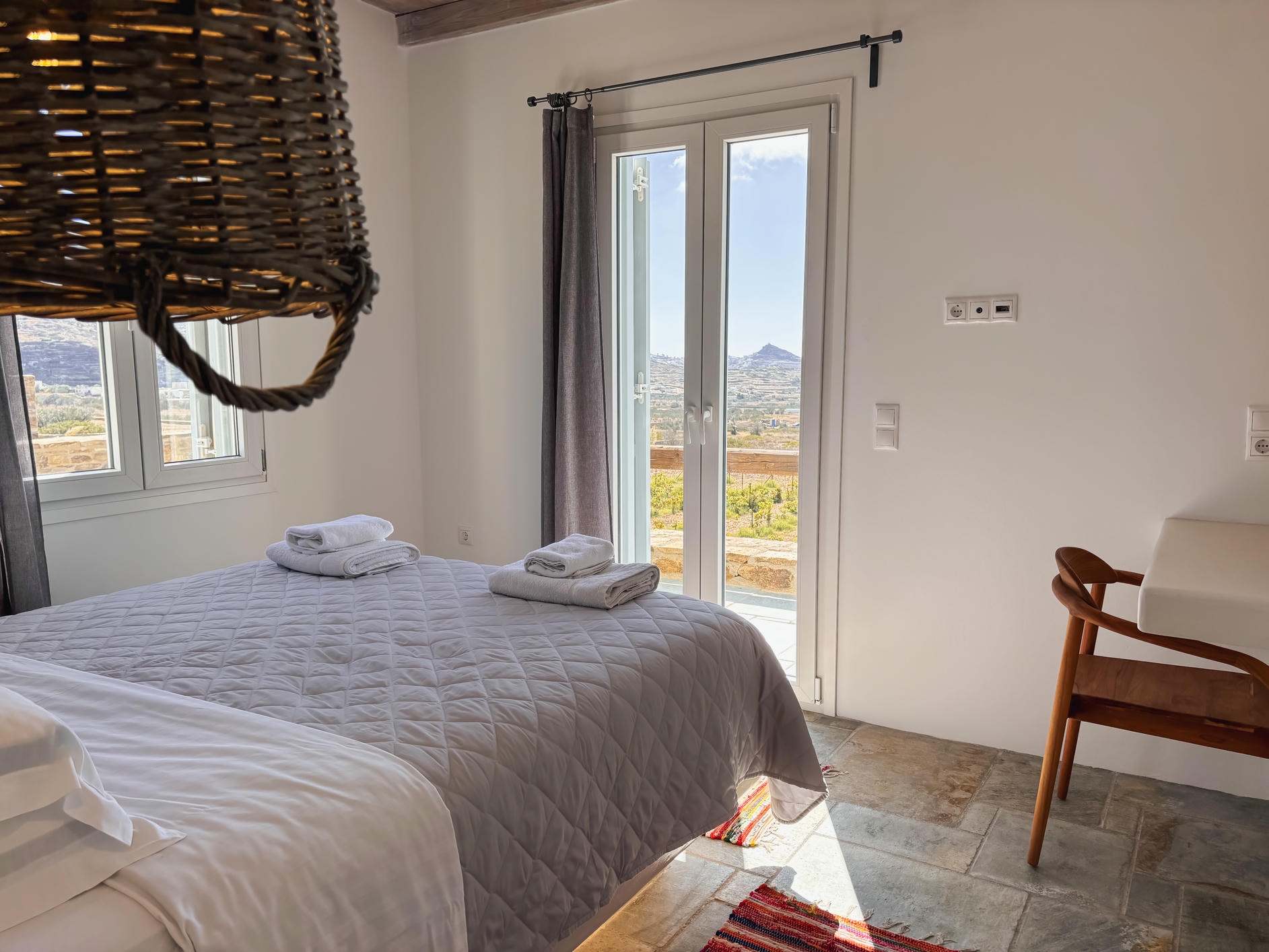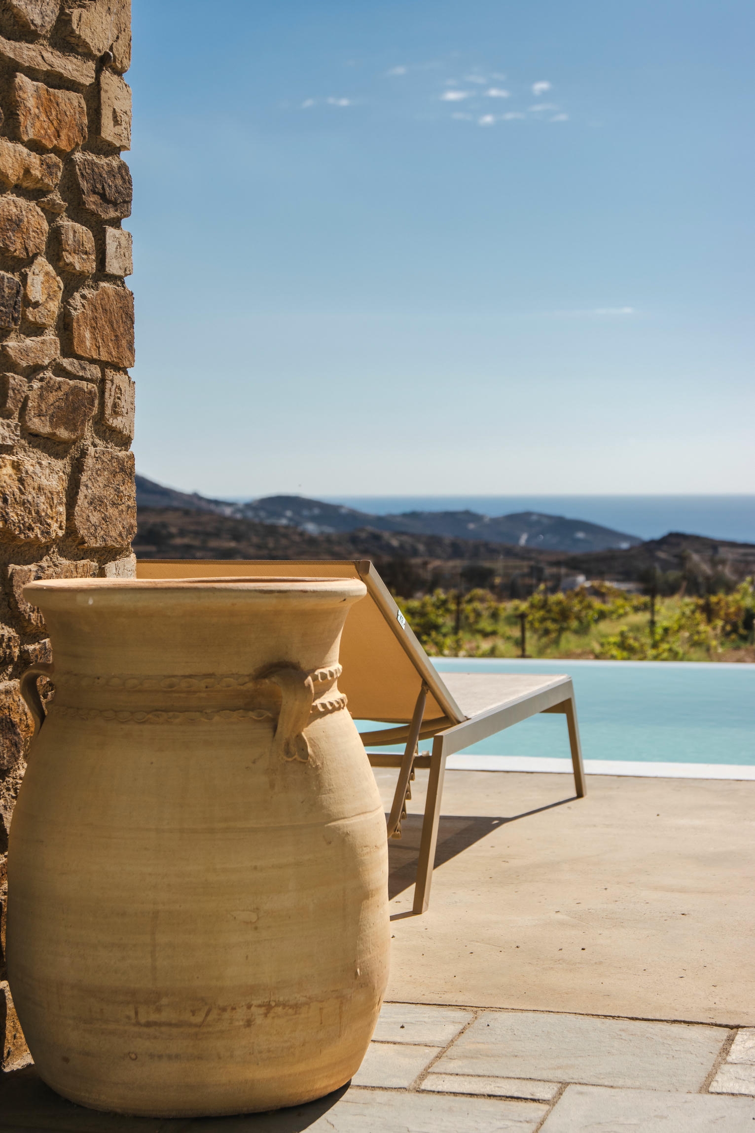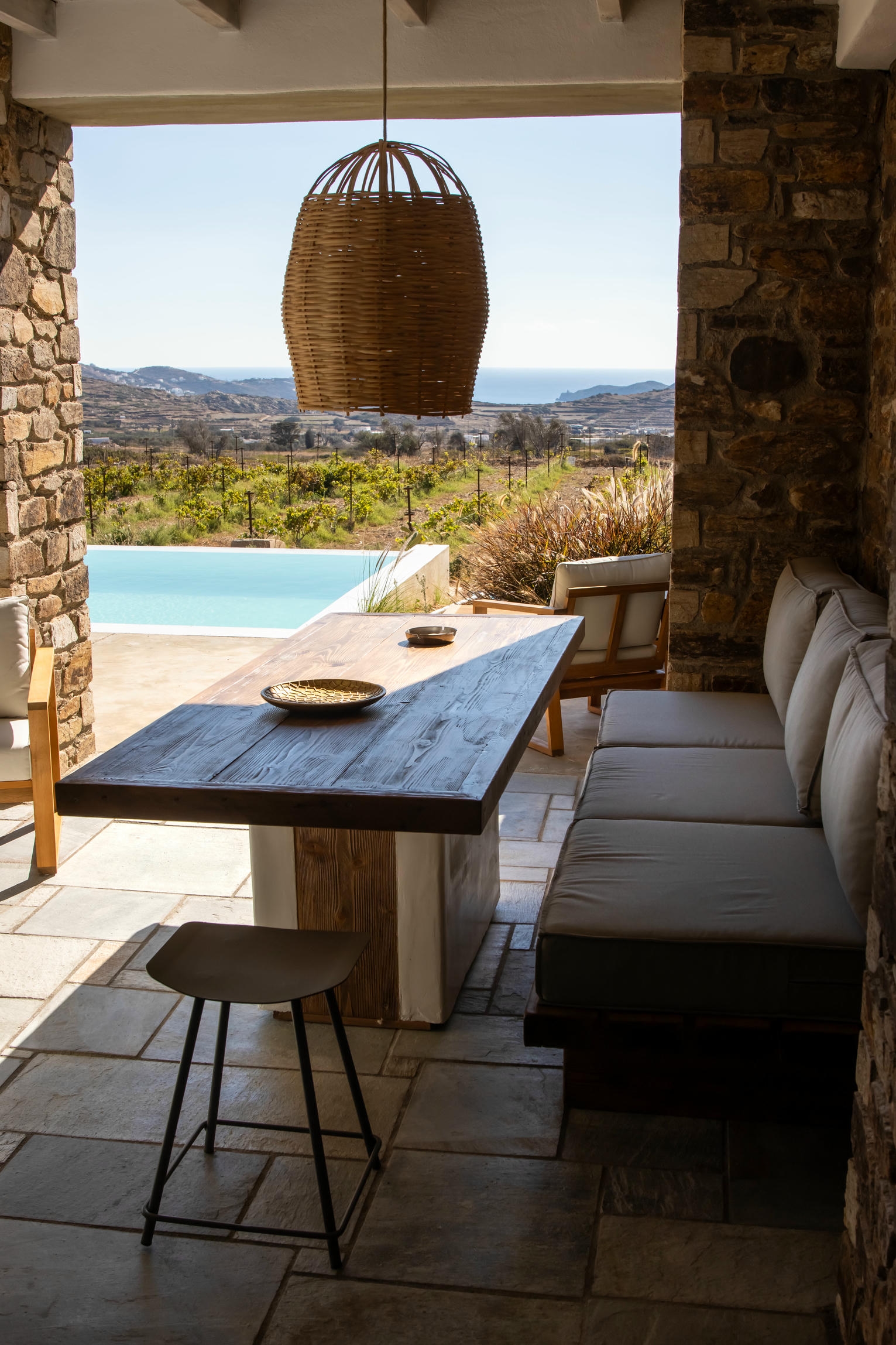 This villa combines comfort and elegance with two serene bedrooms with en suite bathrooms, a bright open-plan living room and a fully equipped kitchen with a dining island. Modern amenities include WiFi, air conditioning and private parking. Outside, a private pool, inviting sun loungers and a shaded dining area offer the perfect setting for relaxation, surrounded by the gentle beauty of the vineyards and the timeless charm of the Greek islands.